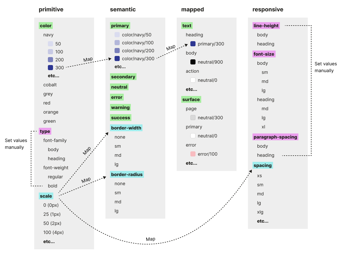 We used a three-tier token structure (primitive, semantic, and component-mapped) and added a fourth “responsive” tier to group values that would change across breakpoints in future (mobile, tablet, desktop).