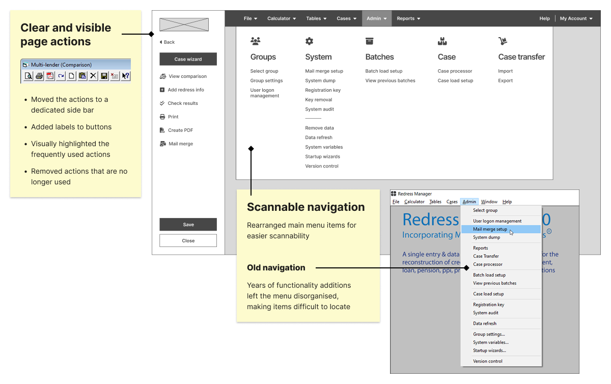 I conducted a detailed review of the legacy Redress Manager interface to understand its structure, workflows, and usability gaps.